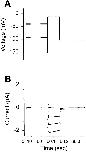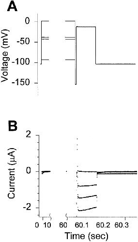 Figure 3. Voltage command protocol and representative current traces showing the voltage dependence of slow inactivation of the IFMQ3 channel. Xenopus oocytes were coinjected with in vitro transcribed RNA encoding the sodium channel α and β1 subunits. After 2 d incubation at 20°C, data were recorded using the two-electrode whole cell voltage clamp as described in materials and methods. Oocytes were held at −100 mV, and slow inactivation was induced by 60-s depolarizations from −90 to +5 mV in 5-mV steps. This was followed by a 20-ms hyperpolarization to −150 mV to allow recovery from fast inactivation (if any, since the channels all contain the IFMQ3 mutation) and a 100-ms test depolarization to −10 mV. (A) Representative traces of the command potential are shown for depolarizations to −90, −40, −35, and +5 mV. (B) The current recorded during the same series of depolarizations is shown. The largest inward current was obtained at a prepulse of −90 mV and essentially no current can be elicited after a +5-mV depolarization.
