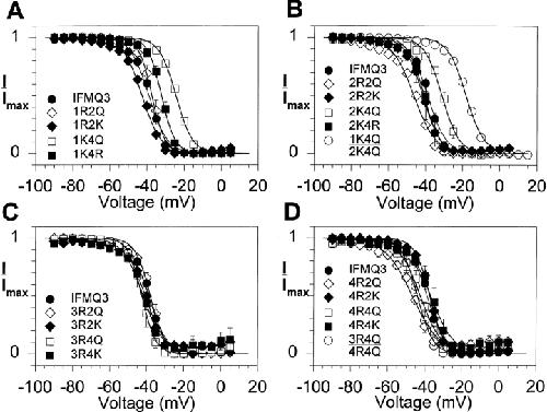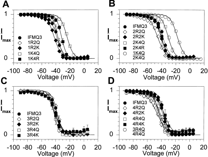 Figure 4. Effects of S4 mutations on steady state slow inactivation when fast inactivation is eliminated. Xenopus oocytes were injected with RNA encoding the IFMQ3 sodium channel or each of the S4 mutants in the IFMQ3 background, along with RNA encoding the β1 subunit. Currents were recorded as described in Fig. 3. The normalized peak current during the test pulse is plotted against the prepulse potential. Data are shown for the mutants in domains I (A), II (B), III (C), and IV (D). Data for the double mutants are shown in B and D. The data points represent the means of at least three determinations and the error bars show the standard deviations. The smooth lines are fits to a two-state Boltzmann function, as described in materials and methods. The parameters of the fits are included in Table II.