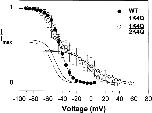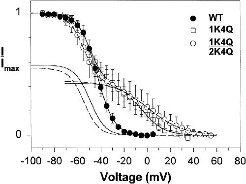 Figure 6. The 1K4Q mutation results in two components of slow inactivation when fast inactivation is intact. Steady-state slow inactivation of the wild-type sodium channel is compared with that of the 1K4Q and 1K4Q:2K4Q mutants. The smooth lines are fits to a single Boltzmann function for the wild-type channel, and the sum of two Boltzmann functions for the mutants. The parameters of the Boltzmann fits are shown in Table III.