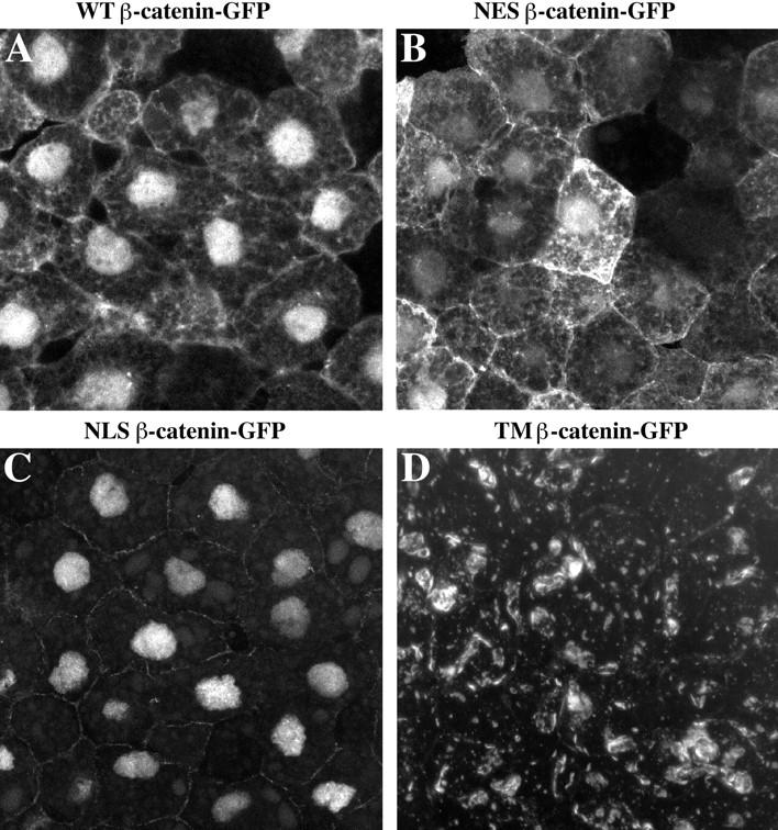 Figure 2. Localization of wild-type and mutant β-cateninâGFP proteins in animal cap cells. The intracellular distribution of each mutant was determined by confocal microscopy (AâD). The WTâ β-cateninâGFP protein (A) is localized to the plasma membrane, cytosol, and nucleus in a pattern indistinguishable from that seen for endogenous β-catenin protein (Yost et al., 1996). NESâβ-cateninâGFP (B) is present at plasma membrane and at high levels in the cytoplasm. Low levels of fluorescence are detected in the nucleus, which likely reflects the fact that the NES domain does not inhibit nuclear entry but instead promotes the rapid export of tagged proteins from the nucleus. NLSâβ-cateninâGFP (C) is predominantly found in the nucleus, and very little fluorescence is observed in the cytoplasm or in association with the plasma membrane. The TMâβ-cateninâGFP mutant (D) localizes to intracellular vesicles and organelles in apparent association with the endoplasmic reticulum and Golgi apparatus. TMâβ-cateninâGFP fluorescence was never detected in the nucleus.