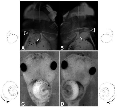 ventral views of stage 45 embryos injected with pCSKA/Xnr-1 with normal looping of the heart