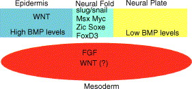 Genes referenced: ctnnb1 fgf4 fgf8 foxd3 fzd3 gsk3b lrp6 msx1 myc nog pax3 snai1 snai2 sox10 sox2 sox3 tfap2a wnt1 wnt3a wnt7b wnt8a