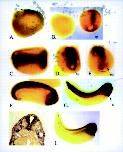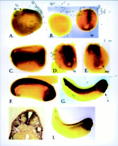 Figure 6. âEmbryonic expression of Xqua mRNA. Whole-mount in situ hybridization using an RNA probe specific to the 5-kb embryonic form of Xqua. (A) Lateral view of a stage 11 gastrula embryo shows that transcripts are first detected in the chordamesoderm of the dorsal blastopore lip. (B) By late gastrula, Xqua is strongly expressed in the notochord with weak expression in the circumblastoporal region (B, embryo on the right, dorsal view). Embryos hybridized with sense strand control probes (B, embryo on the left) show no staining. In neurula embryos (stage 18) (C, dorsal view;D, posterior view; E, anterior view), the expression domain has expanded to include the notochord, paraxial mesoderm, circumblastoporal region, and the neural plate. In tailbud embryos (stages 24â30) (F,G), Xqua is strongly expressed in the brain and neural tube, the developing heart, tail blastema, and branchial arches. (G) By late tailbud (stage 30), the expression in the notochord and somites is declining. (H) Cross sections through the head of the stage 30 whole-mount embryo show that expression in the brain is largely restricted to the ventricular and marginal zones and the floor plate. (I) Later in development at hatched tadpole stage, Xqua expression is almost exclusively in the head and heart. (anp) Anterior neural plate; (bp) blastopore; (dl) dorsal lip; (h) heart; (n) notochord. |