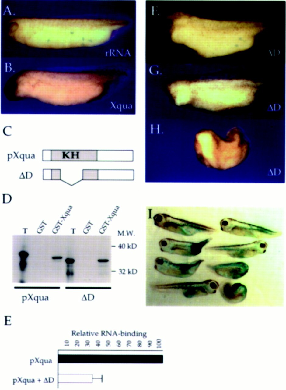 Figure 7. âOverexpression of Xqua and δD causes defects in anterior development. Synthetic mRNA encoding either pXqua357, the truncated pXqua protein δD (which lacks the KH motif), or control rRNA was overexpressed in embryos by microinjection into the equatorial region of each of the two dorsal blastomeres at the four-cell stage. (A) Overexpression of rRNA (2.5 ng/blastomere) has no effect on development. (B) Dorsal injection of Xqua mRNA (2.5 ng/blastomere) resulted in exaggerated anterior development including elongation of the hindbrain region and reduced cement glands. (C) Schematic representation of pXqua357 and δD proteins. Representative embryos illustrating the phenotypes are shown. (D) The δD protein is able to form dimers with wild-type pXqua. 35S-Labeled pXqua357 or δD was incubated with either 2 μg of GST alone or a GSTâXqua fusion protein coupled to glutathioneâSepharose. The bound proteins were resolved on 12% SDS-PAGE and visualized by fluorography. The lane marked T represents 20% of the input translation. (E) δD/pXqua heterodimers have reduced RNA-binding activity. 35S-Labeled pXqua was synthesized in vitro, either alone or by cotranslation with a fivefold excess of δD mRNA. The RNA-binding activity of the wild-type pXqua, or the δD/pXqua mixture, was assayed by binding to poly(G)âagarose. Bound proteins were resolved on 12.5% SDS-PAGE and quantitated by PhosphorImager analysis. The results, averaged from three separate experiments, are presented as a histograph that indicates that δD/pXqua heterodimers exhibit impaired RNA binding. Dorsal overexpression of δD resulted in a dose-dependent deletion of anterior structures ranging from (F) microcephalic and (G) acephalic embryos at low mRNA levels (0.5â1.25 ng/blastomere) to (H) severe anterior-half truncations at higher doses (2.5 ng/blastomere). (I) Lineage tracing of embryos coinjected with a high dose of δD and β-galactosidase mRNA shows that the phenotypic effects of δD are specific to dorsal tissues. The tissue expressing the injected mRNA is stained blue. |