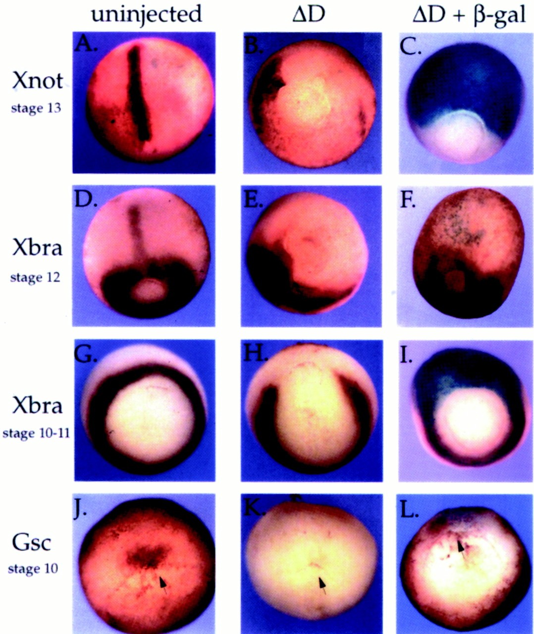 Figure 10. Inhibition of Xqua function results in down-regulation of early notochord marker mRNAs. mRNA (2.5 ng) encoding the dominant-negative pXqua protein δD or δD plus β-galactosidase was microinjected into the equatorial region of each of the two dorsal blastomeres at the four-cell stage. The resulting embryos, together with uninjected control embryos, were fixed at gastrula stages and analyzed by whole-mount in situ hybridization for expression of early dorsal mesoderm and notochord mRNA markers:Xnot-2 (AâC), Xbra (DâI), andgsc (JâL). Arrows indicate the location of the dorsal lip in early stage embryos. In C, F, I, and L,embryos were stained with X-gal (blue) prior to in situ hybridization (purple/brown), to indicate the cells that received the δD mutant. Overexpression of δD in the dorsal mesoderm results in disruption of gastrulation and a loss of detectable Xnot-2, Xbra, and gsc transcripts in recipient cells. |