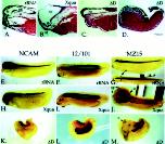 Figure 8. âHistological and immunostaining analysis of abnormal development resulting from dorsal Xqua and δD overexpression. Control rRNA, Xqua, or δD was microinjected into the equatorial region of each of the two dorsal blastomeres at the four-cell stage (2.5 ng/blastomere, except embryo in C that was 1.25 ng/blastomere). Representative embryos were examined by (AâD) histological sectioning and hemotoxylin/eosin staining or by whole-mount immunostaining with the monoclonal antibodies (E,H,K) Anti-NCAM for neural tissue, (F,I,L) 12/101 for somites, and (G,J,M) MZ15 for notochord. Control embryos injected with rRNA are shown in A, E, F, and G; embryos overexpressing Xqua are shown in B, H, I, and J; and embryos overexpressing δD are shown in C, D, K, L, and M. In all panels, anterior is left and a lateral view is shown, except thebottom image in G and J, which are dorsal views. (A,G) In control embryos the notochord ends anteriorly behind the forebrain. (B) Dorsal injection of Xquaresults in an elongation of the notochord into the head until it reaches the ventral pharyngeal endoderm and (B,H) a reduction in forebrain and anterior facial structures with an enlarged hindbrain vesicle. (J, dorsal view) Xqua overexpression occasionally results in duplications of the notochord and facial structures; notice two notochords lying side by side and two cement glands. (I) The somites are relatively normal in Xquaoverexpressing embryos. (C) Histological section of embryos with a low-level overexpression of δD (1.25 ng/blastomere) shows a truncation of the anterior notochord with a loss of forebrain and anterior head structures. (D,K,L,M) High-level overexpression of δD (2.5 ng/blastomere) causes a complete truncation of the anterior half of the embryos. (K) These embryos exhibit little neural tissue, (L) reduced somites, and (M) only small amounts of posterior notochord tissue. δD embryos show a high frequency of spina bifida resulting in a splitting of the residual notochord tissue; notice the duplicated notochord in the tail. (cg) Cement gland; (fb) forebrain; (hb) hindbrain; (n) notochord; (o) otic vesicle; (pe) pharyngeal endoderm. |