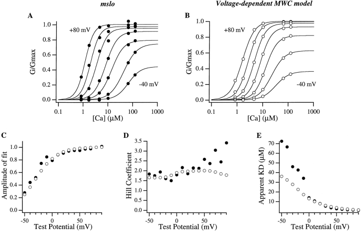 Large-conductance Ca-activated potassium channels (BK channels) are uniquely sensitive to both membrane potential and intracellular Ca2+. Recent work has demonstrated that in the gating of these channels there are voltage-sensitive steps that are separate from Ca2+ binding steps. Based on this result and the macroscopic steady state and kinetic properties of the cloned BK channel mslo, we have recently proposed a general kinetic scheme to describe the interaction between voltage and Ca2+ in the gating of the mslo channel (Cui, J., D.H. Cox, and R.W. Aldrich. 1997. J. Gen. Physiol. In press.). This scheme supposes that the channel exists in two main conformations, closed and open. The conformational change between closed and open is voltage dependent. Ca2+ binds to both the closed and open conformations, but on average binds more tightly to the open conformation and thereby promotes channel opening. Here we describe the basic properties of models of this form and test their ability to mimic mslo macroscopic steady state and kinetic behavior. The simplest form of this scheme corresponds to a voltage-dependent version of the Monod-Wyman-Changeux (MWC) model of allosteric proteins. The success of voltage-dependent MWC models in describing many aspects of mslo gating suggests that these channels may share a common molecular mechanism with other allosteric proteins whose behaviors have been modeled using the MWC formalism. We also demonstrate how this scheme can arise as a simplification of a more complex scheme that is based on the premise that the channel is a homotetramer with a single Ca2+ binding site and a single voltage sensor in each subunit. Aspects of the mslo data not well fitted by the simplified scheme will likely be better accounted for by this more general scheme. The kinetic schemes discussed in this paper may be useful in interpreting the effects of BK channel modifications or mutations.