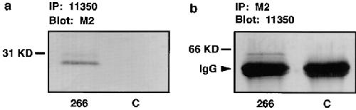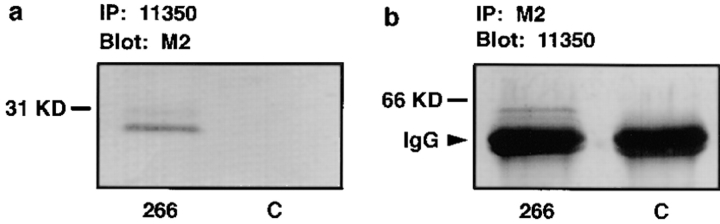 Figure 7. The interaction of Xenopus occludin with chicken occludin in vivo assayed by immunoprecipitation. The embryos were microinjected with the most COOH-terminally truncated occludin mRNA (266; a and b, left lanes) or water (C; a and b, right lanes) and incubated at room temperature for 10 h. After homogenization, the samples were centrifuged at 100,000 g for 30 min at 4°C. The membrane pellet was solubilized in modified RIPA buffer (see Materials and Methods) and centrifuged at 100,000 g for 1 h at 4°C. The resulting supernatant was immunoprecipitated with anti-occludin 11350 (a) or anti-FLAG M2 (b) overnight at 4°C. Immunoprecipitates were immunoblotted with anti-FLAG M2 (a) or anti-occludin 11350 (b). A specific band corresponding to the chicken truncated occludin (compare with Fig. 2 b, lane 266) was present in a (left lane) after immunoprecipitated with anti-occludin 11350. The Xenopus full-length occludin was observed at b (left lane) after immunoprecipitated with anti–FLAG M2. The two thick bands in b were IgG heavy chain.