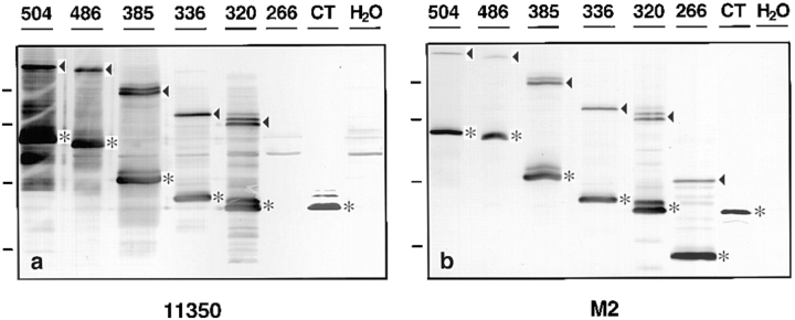 Figure 2. Western blot analysis of Xenopus oocytes injected with mRNAs corresponding to the occludin proteins diagrammed in Fig. 1. mRNAs were microinjected in the vegetal hemisphere of stage VI oocytes, and the injected oocytes were incubated at 17°C overnight. Oocyte homogenates were separated on 12% SDS-PAGE, transferred to Immobilon membranes, and then immunoblotted with either anti-occludin antibody 11350 (a) or with anti-FLAG monoclonal antibody M2 (b). The number on the top of each lane identifies each protein as named in Fig. 1. The asterisks in a and b indicate the predicted position of each expressed protein. With the exception of the soluble CT, the expressed proteins formed dimers as indicated by the arrowheads. Note that protein 266, with almost the entire COOH terminus deleted, was not recognized by 11350 antibody. H2O, control oocytes injected with water. Molecular weight markers (from top to bottom): 97.4, 66, 45, and 31 kD.