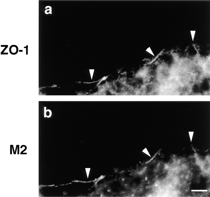 Figure 6. Immunocolocalization of Xenopus ZO-1 with the protein directed by mutant 266, the most truncated occludin in Xenopus embryos. Frozen sections were made of embryos injected with mutant 266 mRNA and stained with either anti–ZO-1 (a) or with anti-FLAG M2 (b). The arrowheads indicate the colocalization of both proteins at the junctional complexes. Bar, 10 μm.