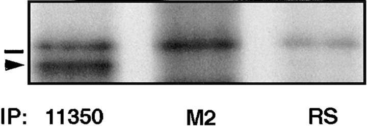 Figure 8. Coimmunoprecipitation of the mutant with endogenous occludin was not the result of exchange of monomers between detergent-solubilized oligomeric assemblies. Confluent A6 cell monolayers were metabolically labeled with 150 μCi/ml [35S]methionine/cysteine for 20 h at 27°C, solubilized under nondenaturing conditions, and then mixed with similarly detergent-solubilized supernatant from Xenopus embryos injected with 266 construct mRNA at the two-cell stage and incubated for 10 h at room temperature. After immunoprecipitation with anti-occludin 11350 (left lane), anti-FLAG M2 (middle lane), or preimmune rabbit serum (right lane), samples were separated on 12% SDS-PAGE and autoradiographed. 35S-labeled occludin could not be immunoprecipitated with anti-FLAG M2 (middle lane), demonstrating that mixing of the mutant with wild-type molecules after extraction did not result in detergent-mediated exchange of protein monomers. The bar above the arrowhead indicates the molecular weight marker 66 kD.