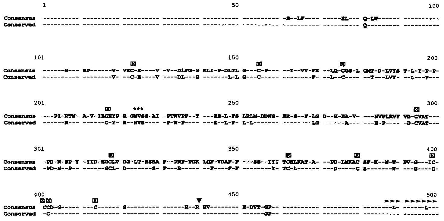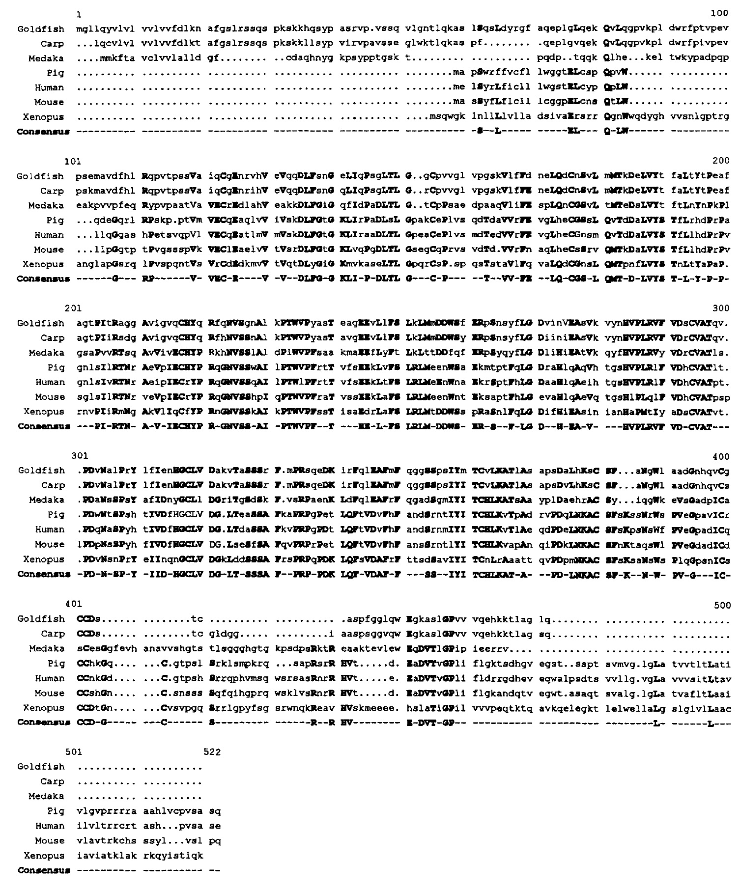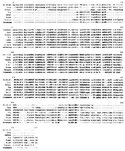 The glycoproteins of the Xenopus laevis egg envelope function in fertilization and development. As the unfertilizable coelomic egg transits the pars recta region of the oviduct, it is converted to a fertilizable egg by limited proteolysis of the envelope glycoprotein gp43 to gp41. This conversion is caused by an oviductally secreted serine active site protease, oviductin. We cloned a cDNA for gp43 from an oocyte cDNA library. The cDNA encoded a 454 amino acid protein homologous to the ZPC family of glycoproteins previously shown to be present in mammalian and fish egg envelopes. Conserved ZPC domains and motifs present in the Xenopus sequence included a signal peptide sequence, an N-linked glycosylation site, and 12 aligned Cys residues. In mammalian and Xenopus sequences, a furin-like (convertase) site and a C-terminal transmembrane domain were present reflecting the biosynthesis of ZPC in these species via the secretory glycoprotein pathway. However, fish envelope glycoproteins lack these sequences since they are synthesized via a different route (in the liver, transported to the ovary, and assembled into the egg envelope surrounding the oocyte). Consensus amino acid residues were identified by sequence comparisons of seven ZPC family members; 19% of the amino acid residues were invariant and 48% of the residues were identical in at least four of the seven sequences. The consensus sequence was used to make structure-fertilization function predictions for this phylogenetically conserved family of glycoproteins.