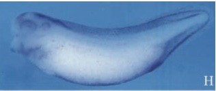 Fig. 3. Spatial distribution of msx1 transcripts during early Xenopus development. Whole-mount in situ hybridization of albino embryos using a digoxigenin-labeled antisense msx1 probe. msx1 transcripts are detectable from midgastrula stages (stage 11; A,B). Dorsal (A) and lateral (B) views indicate the localization of msx1 transcripts in the ventral animal and marginal regions of the embryo. Dorsal (C) and lateral (D) views at early neurula stages indicate that the expression of msx1 gradually divides into ventral and dorsal regions, and that the dorsal expression is restricted to the border of epidermis and neural plate. a, anterior; p, posterior; d, dorsal; v, ventral. (E,F) Dorsal and ventral views of stage 17 embryos, respectively, and anterior is up. As the neural tube closes, the expression of msx1 is observed in the dorsal neural tube (E) and the heart and around blastopore on the ventral side (F). At tailbud (G) and tadpole (H) stages, expression is detected in fin, cement gland, dorsal neural tube, otic vesicle and, broadly, in the ventral region.