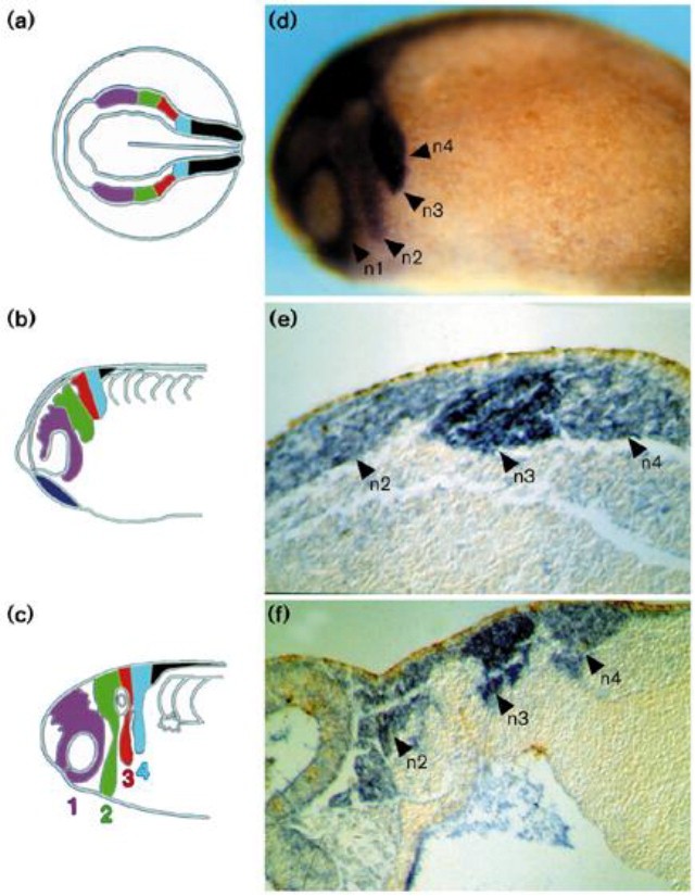 Figure 1. Restricted migration of branchial neural crest cells in Xenopus. (a) The initial segmentation and (b,c) migration of streams of neural crest into specific branchial arches (1â4). The third and fourth arch neural crest streams segment during migration. Adapted from [15]. (d) Expression pattern of AP-2 plus Krox-20 in a stage 25 Xenopus embryo revealed by whole-mount in situ hybridisation. AP-2 is expressed in all branchial neural crest (n1ân4: neural crest streams migrating into branchial arches 1â4), whereas Krox-20 expression is restricted to third arch neural crest (see also Figure 2f), which therefore is stained more intensely. (e) Section through dorsal region of migrating neural crest after detection of AP-2 plus Krox-20 expression. The neural crest destined for the second, third and fourth arches are adjacent. (f) Section through a more ventral region of the embryo shown in (d). After migration deep into the branchial arches, the streams of second, third and fourth arch crest are now separated by the pharyngeal pouches of the endoderm.