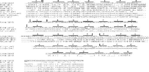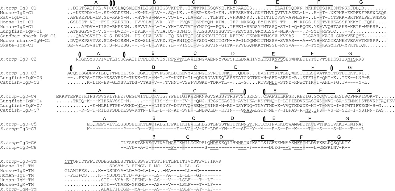 Fig. 2. Alignment of Xenopus IgD H chain to IgD and IgW H chains from other species. Amino acid sequences were deduced from the δ cDNA sequence (GenBank accession no. DQ387453) isolated from X. tropicalis spleen. Alignments were made by using clustal x with minor manual adjustments. Domain designation was based on exon/intron boundaries. Bars and dots indicate identical amino acids and gaps, respectively. Potential IgSF strands are indicated as AâG with lines over the sequences. Noncanonical cys are marked with an open oval, and canonical cys and trp found in most IgSF domains are shaded. Glycosylation sites are underlined.