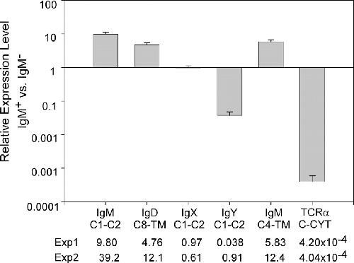 Fig. 5. Relative expression level of four Ig isotypes in IgM+ vs. IgM− splenocytes. qPCR analysis was done by using SYBR green, and each run was performed in triplicate. The relative expression level was calculated by using 2−δδCt method as 10A9+ vs. 10A9− cells and plotted on a log scale in sigma plot. Primer sets are shown underneath. The figure represents the mean value of Experiment 1 (three separate runs) with standard deviations shown in bars. Mean values of two separate experiments are also shown underneath. Each threshold cycle (Ct) was normalized to the Ct of LMPX. The raw threshold cycle (Ct) values are presented in Table 1.