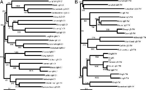 Fig. 6. Phylogenetic relationship of Xenopus IgD to IgD and IgW from other species. Neighbor-joining bootstrapping trees (1,000 runs) of C1 (A) and TM (B) domains were made. Gaps were included, and multiple substitutions were not taken into account. The scales show the genetic distances. The scale shown as a bar represents the genetic distance (i.e., number of amino acid changes in the given scale). GenBank accession nos. for each sequence are as follows: Human-IgD (AAH21276), Mouse-IgD (AAB59654), Rat-IgD (AAO19643), Horse-IgD (AAU09793; ref. 44), Lungfish-IgW (AAO52811), Sandbar shark-IgW (AAB03680), Nurse shark-IgW (AAB08972), Skate-IgX (AAA49546), Catfish-IgD (AAC60133), Halibut-IgD (BAB41204), Atlantic Cod-IgD (AAF72566), Rainbow trout-IgD (AAW66976), Human-IgM (AAH11857), Mouse-IgM (AAH18315), Rat-IgM (AAH92582), Chicken-IgM (P01875), X. laevis-IgM (AAA49774), X. tropicalis-IgM (AAH89679), Lungfish-IgM (AAO52808), Nurse shark-IgM (AAA50817), Horn shark-IgM (P23085), and Skate-IgM (AAA49547).