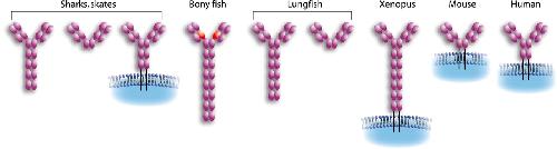 Fig. 7. Plasticity of IgD/W in different vertebrate species. TM and secretory forms are obviously displayed. TM forms are the major type in frog, mouse, and human. The TM and secretory forms are shown for IgW to emphasize the alternative splicing. No TM forms have been described in lungfish, and the TM/secretory forms in bony fish are the same size. L-chain association is predicted only in bony fish, Xenopus, and lungfish. Only one form of ray-finned bony fish IgD (the original catfish model) among several other forms is shown here, and the light-red domain is the C1 domain donated from the μC1 domain. The hinge regions are not shown for mouse and human δ chains.