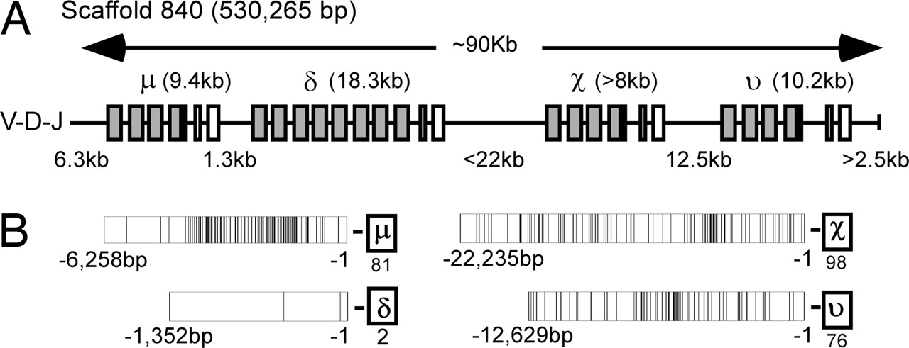 Fig. 1. The X. tropicalis δ gene is immediately 3â² of the μ gene. (A) X. tropicalis genome scaffold (version 3.0) 840 contains the IgH locus. C, secretory, and TM regions are indicated as gray, black, and open boxes, respectively. The approximate size of the Ig genes and intergenic regions is shown. The ÏC1 domain is only a prediction, because it has not been assembled into the scaffold. The C domains are located at the edge of the scaffold spanning an â90-kb region. (B) AGCT motifs are rich in 5â² upstream region of μ, Ï, Ï , but not in that of δ. The distance and positions of AGCT motifs are shown as bars. The numbers of AGCT motifs found in these regions are also shown under each Ig isotype. All diagrams are not to scale.