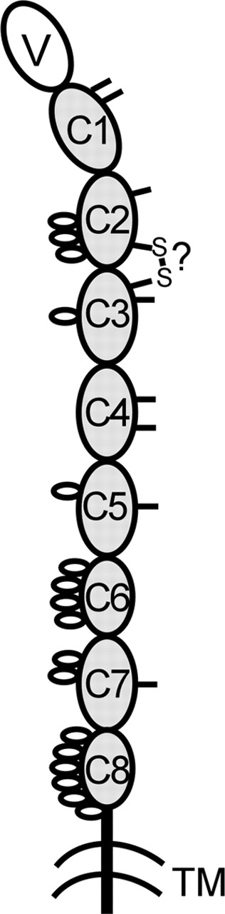 Fig. 3. Cartoon of Xenopus IgD H-chain structure. The V and C domain are shown as large ovals, and sugars and noncanonical cys residues are indicated as small open ovals (on the left) and ticks (on the right). GenBank accession nos. are shown in the legend Fig. 6.