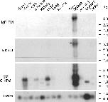 Fig. 4. Xenopus IgD is expressed predominantly in the spleen. Twenty micrograms of total RNA from various tissues of an X. tropicalis frog was loaded on the gel, and the Northern blot was hybridized with X. tropicalis δC1 and TM probes separately. An X. tropicalis μ C1-TM probe was also used to compare the level of expression and tissue distribution. Two bands detected with the μ probe account for the different 3â²-UTR lengths between secretory and TM forms or unknown splice variants specific to this species. Ubiquitously expressed LMPX was used as the loading control. Although the loading amounts are not equal on this blot, IgD is found only in the spleen, despite the fact that less spleen RNA was loaded. RNA size markers are shown on the right.