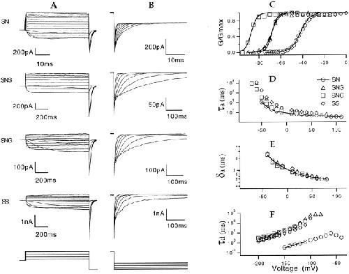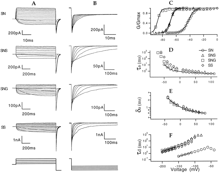 Figure 2. Macroscopic currents from cell-attached patch recordings of the various channel types. (A) Activation currents were induced by depolarizing pulses from a −100-mV holding potential to potentials of: −50 to 100 mV (SN); −80 to 100 mV (SNS); −80 to 30 mV (SNG); and −80 to 60 mV (SS); all in steps of 10 mV except 20 mV for SNS. The post pulse was −140 mV. (B) Tail currents were recorded at voltages of −70 to −150 mV (SN) and −110 to −170 mV (SNS, SNG, and SS) after prepulses to 40 mV (SN) or 0 mV (SNS, SNG, and SS). Potassium ion concentration was 140 mM on each side of the patch. Currents were filtered at 1 kHz. Note the different time scale for SN currents. (C) Representative G-V curves for each channel type, calculated from the macroscopic currents assuming a linear I -V relationship. Superimposed on each curve is a fit of a Boltzmann function. The midpoint voltage V1/2 and effective charge q for each channel type were −41.7 ± 2.7 mV, 5.1 ± 1.1 e0 (SN, n = 3); −66.3 ± 3.4 mV, 7.5 ± 1.2 e0 (SNS, n = 6); −87.9 ± 1.9 mV, 9.2 ± 0.8 e0 (SNG, n = 3); −66.8 ± 2.8 mV, 10.7 ± 1.6 e0 (SS, n = 4). (D) Voltage dependence of the activation time constant τa, estimated by fits of an exponential function to the activation time course, starting from the time when the amplitude is 50% of the final value. (E) Voltage dependence of the activation delay time δa obtained in the same fits as the time at which the extrapolated exponential crosses the current baseline. (F) Voltage dependence of deactivation time constants τd estimated by single-exponential fits. The apparent charge q was 0.80 e0 (SN), 0.96 e0 (SNS), 0.84 e0 (SNG), and 0.83 e0 (SS), as estimated by fitting the last five data points (lines) with the exponential function τ(V) = τ(0)exp(qV/kT). |
