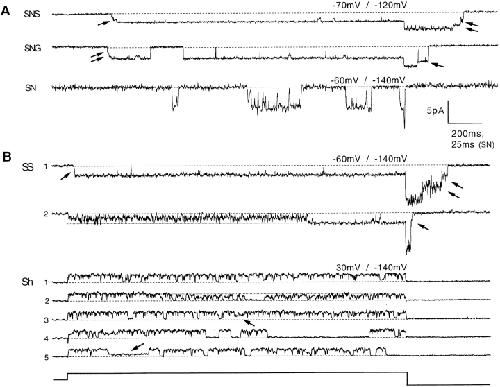Figure 3. Single-channel currents from five channel types, recorded in inside-out patches. (A) Representative single- chan-nel current traces of the SN channel and its derivatives. Potassium ion concentration was 140 mM on each side of the membrane. Channels were activated by a depolarization from a −100-mV holding potential to −60 mV (SN) or −70 mV (SNS and SNG). The tail potential was −140 mV (SN) or −120 mV (SNS and SNG). Note the different time scale for the SN current, which also has a larger single-channel conductance. Some dwells in subconductance levels are indicated by arrows. (B) Single-channel currents of Shaker and its derivative SS. Two selected sweeps recorded in symmetrical 140 mM K+ show the “nonbursting” and “bursting” behaviors of SS. The first sweep contains a brief dwell at a sublevel during activation (arrow) as well as a clear “staircase” of conductances during deactivation. Also shown are five successive sweeps from a truncated Shaker B channel, recorded with 5 mM external K+. Some dwells at subconductance levels are indicated by arrows. For the recording from the NH2-terminal–truncated Shaker B channel, the pipette solution contained 5 mM K-aspartate, 135 mM NMDG-aspartate, 1.8 mM CaCl2, and 10 mM Hepes. All recordings were filtered at 1 kHz. The recordings of SN and SS currents used uncoated patch pipettes, which yielded larger background noise. |