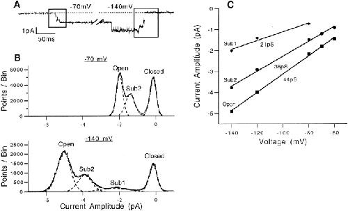 Figure 5. Amplitudes of the three current levels in SNS channels. (A) Representative current trace showing channel activation at −70 mV and deactivation at −140 mV. Boxes indicate regions of this trace used in constructing the amplitude histograms. (B) Amplitude histograms of the single- channel current at the two voltages, accumulated from portions of 380 sweeps as in A. Filter bandwidth was 1 kHz. Superimposed are fits of three (−70 mV) or four (−140 mV) Gaussian functions; the midpoint of each Gaussian is taken to be the mean current amplitude. The standard deviations (in pA) of the Gaussian components are as follows. For −70 mV: 0.25 (closed), 0.36 (sub2), 0.25 (open); for −140 mV: 0.30 (closed), 1.0 (sub1), 0.54 (sub2), 0.50 (open). (C) The mean current amplitudes at different voltages. The superimposed linear fits yield the slope conductances shown. |