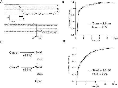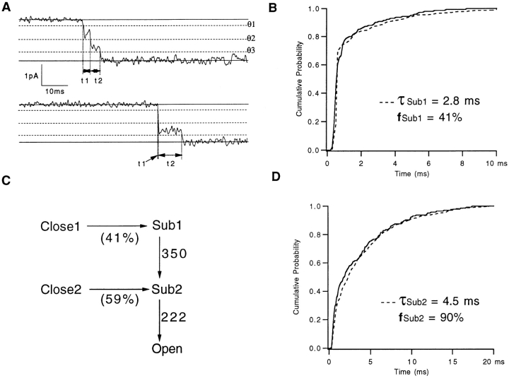 Figure 6. Sublevels of the SNS single-channel current during activation. (A) Representative traces at −70 mV. Solid lines show channel closed and open levels; dashed lines (θ1, θ2, and θ3) are thresholds at 10, 50, and 85% of the open amplitude. In the upper trace, the channel spends t1 = 2.9 ms in the sub1 state and t2 = 3.9 ms in the sub2 state before reaching the open state. In the lower trace, the channel appears to open instantaneously into sub2, but a finite t1 is measured because of filtering. Filter bandwidth is 1 kHz. (B) Cumulative histogram of measured dwell times t1 in sub1 (solid curve) accumulated from 140 events. The dashed curve is the cumulative distribution from a simulation of 250 events with mean lifetime τSub1 and fraction fSub1 of nonzero dwells in sub1 as given. (C) A scheme for channel activation that accounts for the distributions of t1 and t2. Channels can open through two distinct pathways, allowing sub1 to be skipped but always traversing sub2. (D) Cumulative histogram of 140 dwell times at sublevel sub2. The dashed curve is from a simulation of 250 events with the given mean dwell time and fraction of nonzero dwells. |