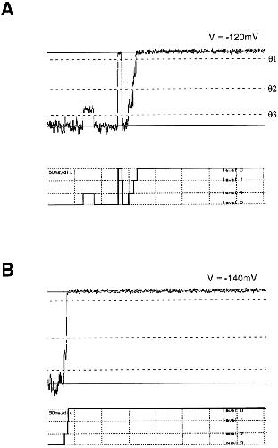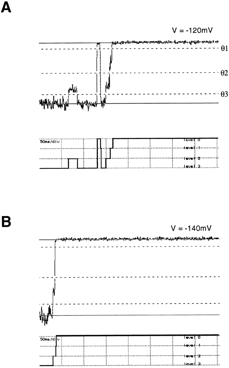 Figure 7. Examples of single-channel tail currents of SNS at −120 mV (A) and −140 mV (B). Solid lines show channel closed and open levels, while dashed lines indicate thresholds θ1, θ2, and θ3 at 10, 50, and 85% of the open level. Data filtered at 1 kHz. Below each trace is the idealized current time course. |