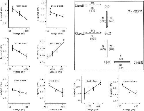 Figure 9. Voltage dependence of transition rates. Rate constants were computed as described in Methods from single-channel activation time courses at −70 mV (n = 3 patches) and deactivation time courses at −100 (n = 2), −120 (n = 4), and −140 mV (n = 3). Superimposed on each plot is an exponential fit of the voltage dependence. The kinetic scheme (inset) summarizes the measurements from both activation and deactivation. Values for the rate constants (in s−1) are given for V = −120 mV. The partial valence associated with each rate constant is given in parentheses. |