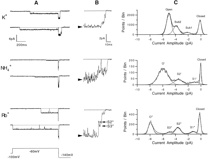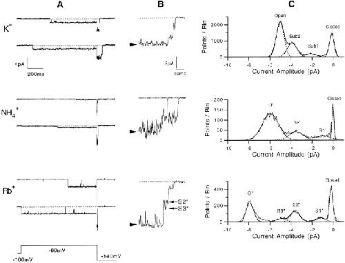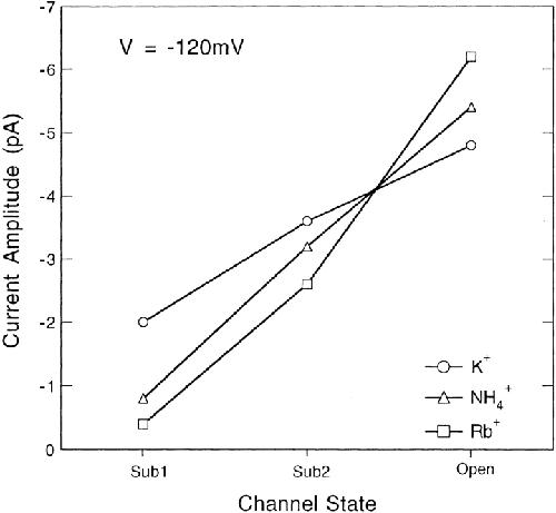 Figure 12. Amplitudes of each current level in SNS channels at −120 mV when K+, NH4+, or Rb+ is the external ion. |