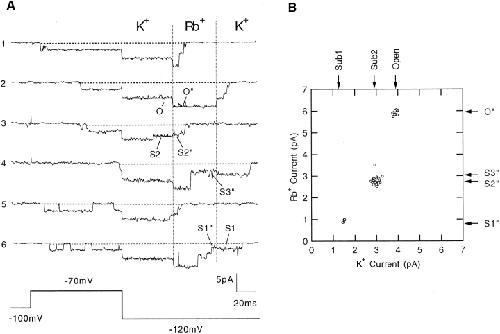 Figure 11. Solution switching experiment. (A) In an outside- out patch, the channel is activated by a depolarization to −70 mV from the −100-mV holding potential. Switching of the external solution occurs during the tail current at −120 mV, as shown by the dotted lines. In traces 1, 2, and 4, the K+ → Rb+ switching occurs while the channel is at the open level; in traces 3 and 5, it occurs while the channel is at sub2 sublevel. Trace 4 shows Rb+ → K+ switching while the channel is at sub2. Trace 6 shows Rb+ → K+ switching while the channel is at sub1. The pipette solution contained 130 mM K-aspartate, 10 mM KCl, 1 mM EGTA, 10 mM Hepes, and the bath solution contained 140 mM K-aspartate, 1.8 mM CaCl2, 10 mM Hepes; each was adjusted to pH 7.3. (B) Scatter plot of mean current values obtained before and after solution switching. Mean current was calculated only from the traces in which the current levels were stable for at least 5 ms both before and after the solution switching. |