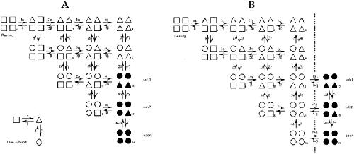 Figure 13. Two speculative gating schemes. (A) The scheme of Zagotta et al. (1994b) is shown, in which a single subunit undergoes two voltage-dependent conformational transitions (inset) to reach a permissive state (circles). Subunit transitions occur independently, with the exception of a slowed transition from the open state 14 to state 13. The scheme has been modified to identify sublevels sub1 and sub2 with states in which two or three subunits are in the permissive state. (B) The scheme Is modified to include a distinct allosteric transition (dotted line) that follows activation of the subunits. The allosteric transition is assumed to be very rapid and switches between fully conducting and nonconducting states. Allosteric equilibria are influenced by a common factor θ that is greatly increased by the T442S mutation. In both schemes, the conducting states are represented by filled symbols. |