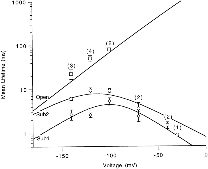 Figure 8. Voltage dependence of mean dwell time in the open state and the two substates. Data points at each voltage represents the mean value, with the number of measurements marked in parentheses (except the data at −30 mV, which represents a single measurement). The curves are the values predicted from the kinetic scheme In Fig. 9. |