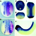 (C), (D), (E), and (F) show expression patterns of a Xenopus kuz gene (Xkuz, partial sequence shown in Figure 1A) at different stages. (C) and (D) show the uniform expression of Xkuz in stage 13 embryos (dorsal view in [C] and lateral view in [D]). The ventral vegetal cells were not stained (D), most likely due to the low penetrance of probes into these cells. In older embryos, Xkuz continues to be widely expressed, with an elevated level in neural tissues (E and F).