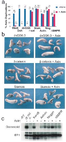 (b) Dorsal injection of Axin reduces expression of dorsal markers Siamois, Goosecoid, Chordin, and Xnr3, but not the ubiquitously expressed elongation factor EF1. Each column shows the RT-PCR analysis of a pool of uninjected embryos or embryos injected at the 4-cell stage with Axin or control β-gal mRNA (2 ng), and grown to early gastrulae. âRT, control experiments in which RNA from uninjected embryos was processed without reverse transcriptase.