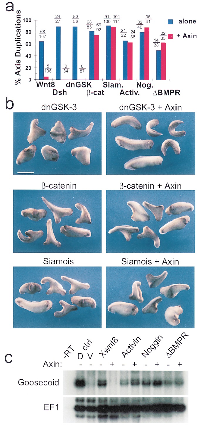 (c) Coinjection of Axin mRNA inhibits induction of the dorsal marker Goosecoid by Xwnt8, but not by Activin, Noggin, or ÎBMPR. Ectopic expression of Goosecoid in the ventral half of early gastrulae (stage