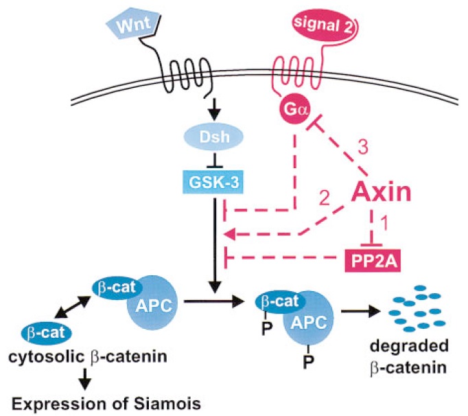 Established components of the Wnt pathway in the Nieuwkoop Center are indicated by blue symbols and solid black arrows, and positions where Axin might inhibit the pathway are indicated by red symbols and dashed arrows. GSK-3 promotes the degradation of β-catenin, while Wnt signals inhibit GSK-3 (via Dsh) and lead to accumulation of cytosolic β-catenin and expression of Siamois. Axin blocks the stimulation of this pathway by Wnt, Dsh, or dominant-negative GSK-3 but not by overexpression of β-catenin or Siamois. Three alternative hypotheses are illustrated: (1) Axin might inhibit a protein phosphatase (PP2A) that may otherwise dephosphorylate substrates of GSK-3; (2) Axin might stimulate the activity of GSK-3 through an unknown mechanism; (3) Axin might inhibit, via its RGS domain, the transmission of a second signal (signal 2) involving a G-protein-coupled receptor, which would otherwise stimulate the Wnt pathway downstream of GSK-3. See text for further details.