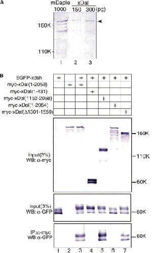 Fig. 2. Direct interaction of xDal with xdsh. (A) mycâmDaple (1000 pg; lane 1), 150 pg of mycâxDal #(1â2058) (150 pg; lane 2, 300 pg; lane 3) were injected into embryos and the protein expression was checked by western blotting with an anti-myc antibody. (B) Immunoprecipitation assays were carried out with full-length xDal and several deletion mutants. mRNAs of EGFP-dsh (500 pg; lane 1), mycâxDal #(1â2058) (1 ng; lane 2), EGFP-dsh and mycâxDal #(1â2058) (lane 3), EGFP-dsh and mycâxDal #(1â431) (500 pg; lane 4), EGFP-dsh and mycâxDal #(1152â2058) (500 pg; lane 5), EGFP-dsh and mycâxDal #(1â2054) (1 ng; lane 6), or EGFP-dsh and mycâxDal #(δ1301â1559) (1 ng; lane 7) were injected into the animal pole of two-cell stage embryos. Injected embryos were harvested at stage 12. Whole-embryo lysates were prepared and 3% were analyzed by western blotting with anti-myc (upper column) or anti-GFP (middle column) antibody. The remainder of the lysates were immunoprecipitated with anti-myc antibody and blotted with anti-GFP antibody (lower column). Positive signal was detected following injection with mycâxDal #(1â2058), mycâxDal #(1152â2058) and mycâxDal #(δ1301â1559). |