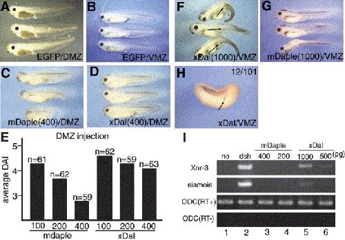 Fig. 4. XDal is a positive regulator of Wnt/β-catenin signaling. (AâE) Dorsal blastomeres of four-cell embryos were injected with 400 pg of EFGP (A), mDaple (C) or xDal mRNA (D), and then embryos were cultured to the tadpole stage. Injection of mDaple caused loss of head formation, but xDal injection did not. (E) These results are shown using the average of the dorso-anterior index (DAI). (F, G) One nanogram of xDal (F) or mDaple (G) was injected into a single ventral blastomere of an eight-cell embryo. Injection with xDal, not mDaple, induced partial secondary axes (arrow). (H) Tailbud embryos injected with xDal (1 ng) into the ventral blastomere were immunostained with a muscle-specific antibody (12/101). Ectopic axis (large arrowhead) and a segmental pattern (small arrow) were seen. (I) Animal caps were excised from embryos injected with xdsh mRNA (500 pg; lane 2), mdaple mRNA (400 pg; lane 3, 200 pg; lane 4) or xDal mRNA (1 ng; lane 5, 500 pg; lane 6). The explants were cultured until control sibling embryos reached stage 9.5, and total RNA was isolated from explants for RT-PCR analysis. Ectopic expression of xdsh or xDal, but not mDaple, induced expression of both siamois and Xnr-3. |