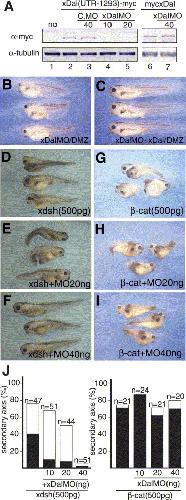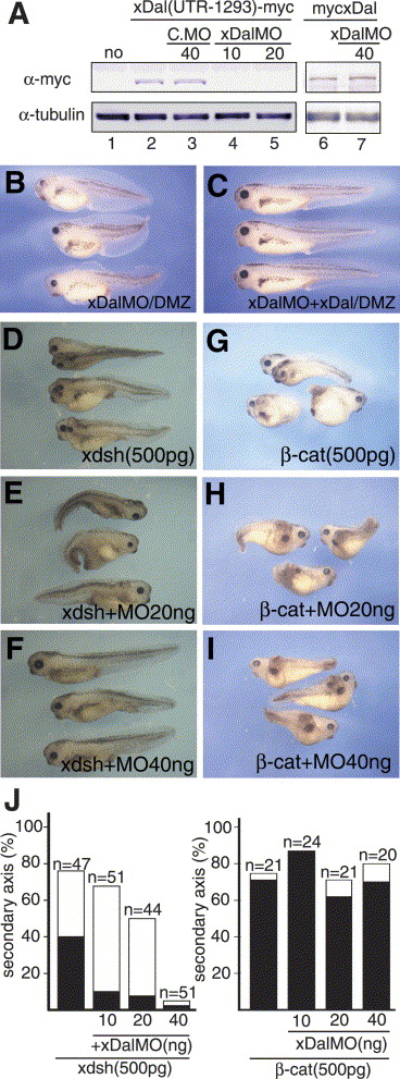 Fig. 6. Superficial defects induced by injection with xDalMO. (A) Inhibition of xDalMO for xDal translation was examined. XDal (UTR-1293)âmyc, which contains the sequence for xDalMO, was co-injected with 40 ng of standard control MO (lane 3) or xDalMO (10 ng, lane 4; 20 ng, lane 5) into embryos. These embryos were harvested at stage 12, and western blot analysis was performed with an anti-myc antibody (column 1). Anti-α-tubulin antibody (column 2) was also used as a quantitative control. When 20 ng of xDalMO was co-injected with xDal (UTR-1293)âmyc, xDal translation was effectively suppressed (lanes 2â5). In contrast, xDalMO did not inhibit mycâxDal, which contains no sequence for xDalMO (lanes 6 and 7). (B, C) Superficial phenotypes of the embryos injected with xDalMO (B) or xDalMO and 500 pg of xDal mRNA (C) into dorsal blastomeres of four-cell embryos. When xdalMO was injected, short axis and weak head defect was observed (B). Co-injection with xDal mRNA completely rescued both phenotypes (C). (DâF) xDalMO inhibited xdsh-induced secondary axis formation. Xdsh (500 pg, D), xdsh and xDalMO (500 pg and 20 ng, E; 500 pg and 40 ng, F) were injected into a ventro-vegetal portion of the embryo. When xDalMO was co-injected, secondary axis formation by xdsh was almost completely suppressed (F). (GâI) Co-injection assay with β-catenin and xDalMO. β-Catenin (500 pg, G) or β-catenin and xDalMO (500 pg and 20 ng, H; 500 pg and 40 ng, I) were injected into a ventro-vegetal portion of the embryo. Co-injection with β-catenin and xDalMO still showed complete secondary axis (I). (J) These results are shown by two graphs. The percentage of incomplete axis and complete axis formation is shown by open and filled bars, respectively. |