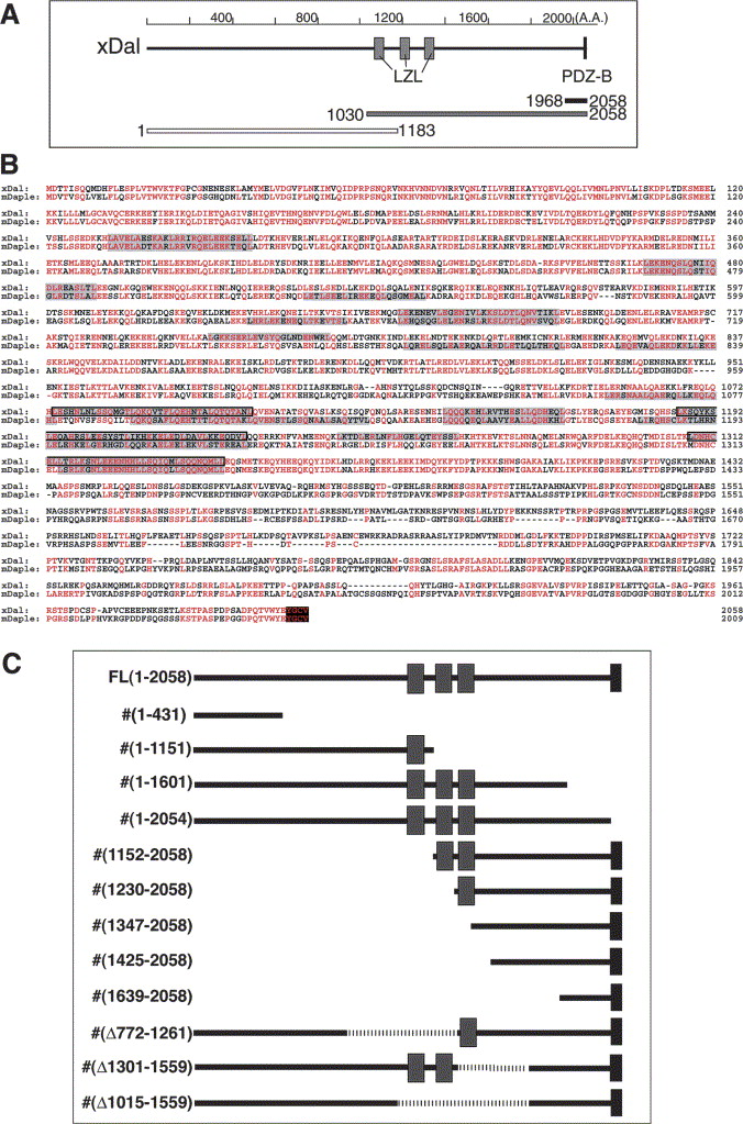 Fig. 1. Structure and amino acid sequence of xDal. (A) Structural features of xDal. The gray boxes and black box represent leucine zipper-like (LZL) regions, which contain at least six leucines, and the PDZ domain-binding (PDZ-B) motif, respectively. The black horizontal line indicates the fragment homologous with mDaple found in the Xenopus EST database. The gray horizontal line represents a fragment isolated by screening the stage-10 Xenopus cDNA library. The white horizontal line represents a fragment isolated by screening the stage-42 Xenopus-specific cDNA library. (B) Alignment of the deduced amino acid sequences of xDal and mDaple. Red characters indicate identical residues in both sequences. The gray boxes represent leucine-heptad repeats, which contain at least four leucines. The black boxes represent the PDZ domain-binding motif. The open boxes represent LZLs (leucine zipper-like region) that contain at least six leucines. (C) Schematic representation of xDal deletion mutants used in this study. The gray boxes represent the leucine zipper-like region. The black boxes represent a putative PDZ-domain-binding motif. The dotted portion of the lines represents a deletion. |