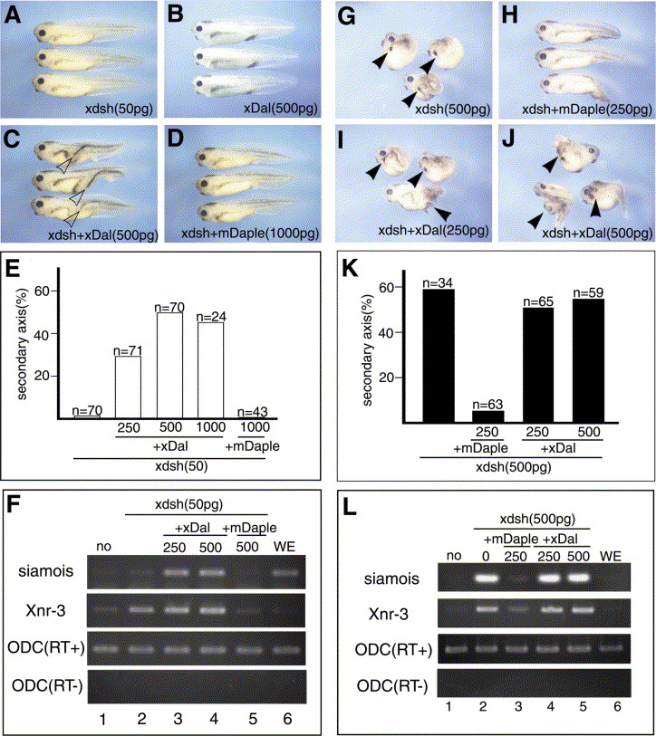 Fig. 5. Different effects of xDal and mDaple on xdsh activity. (AâE) Synergistic induction of secondary axes by co-injection with xDal mRNA and xdsh mRNA. xdsh mRNA (50 pg; A), xDal mRNA (500 pg; B), xdsh and xDal, or xdsh and mDaple (50 pg and 1000 pg; D) were injected into a ventral blastomere at the four-cell stage. Injection with xdsh mRNA or xDal mRNA alone did not induce any secondary axes, whereas co-injection of xDal mRNA and xdsh mRNA induced secondary axes (arrow). Co-injection with mDaple did not induce the secondary axis. These results are shown in the graph (E). The open bars indicate the percentages of induction of incomplete secondary axis with no head. (F) RT-PCR assay to examine positive activity of xDal for xdsh. Xdsh (50 pg, lane2), xdsh and xDal (50 and 250 pg, lane 3; 50 and 500 pg, lane 4), xdsh and mDaple (50 and 500 pg, lane 5) were injected into the animal pole of four-cell embryos. At stage 8.5, animal caps were dissected, and then harvested at stage 10. When a low dose of xdsh was injected, siamois expression was not induced. On the other hand, co-injection with xdsh and xDal synergistically induced siamois expression. Xnr-3 expression was enhanced by xDal, but mDaple inhibited it. (GâK) xDal showed no inhibitory activity for xdsh. When a high dose of xdsh (500 pg) was injected into a ventral blastomere, complete secondary axis was induced (G). Co-injection with mDaple inhibited this ectopic axis formation (H). Conversely, co-injection with xDal retained secondary axis formation (I, J). This result was indicated by the graph. The filled bars indicate the percentages of complete secondary axis formation containing the head structure. (L) XDal and mDaple effects for embryos injected with high doses of xdsh were examined by RT-PCR. Injection with 500 pg of xdsh effectively induced expression of both siamois and Xnr-3 (lane 2). Co-injection with 250 pg of mDaple inhibited expression of both siamosis and Xnr-3 (lane 3), but xDal, even 500 pg, did not inhibit expression of these genes (lanes 4 and 5). |