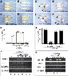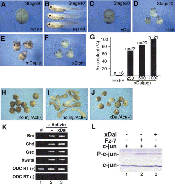 Fig. 7. XDal is a potent activator of the JNK pathway. (AâF) Dorsal blastomeres of four-cell embryos were injected with EGFP mRNA (1 ng; A, B), xDal mRNA (1 ng; C, D), mDaple mRNA (200 pg; E) or xStbm mRNA (400 pg; F), and the embryos were cultured to the tadpole stage. These embryos were examined at the neurula-stage (A, C) or tadpole-stage (B, DâF). Embryos injected with EGFP mRNA (1 ng) were used as controls. Injection with xDal mRNA (C, D), mDaple (E) and the PCP gene, xStbm (F), results in gastrulation-defective phenotypes. (G) Gastrulation-defective phenotypes were caused in a dose-dependent manner. (HâJ) Activin-dependent animal cap elongation assay. A 1 ng dose of xDal mRNA was injected (J), then animal caps were dissected at stage 8.5, treated with activin (I, J), and harvested at stage 17. XDal blocked the activin-induced elongation of animal cap explants (J). (K) Induction of mesodermal markers in animal caps by activin was observed by RT-PCR. Lane 1, uninjected and untreated animal caps. Lane 2, uninjected and activin-treated animal caps. Lane 3, xDal mRNA-injected and activin-treated animal caps. xDal did not affect expression of any of the markers (lane 3). Bra, brachyury; Chd, chordin; Gsc, goosecoid. (L) Enhancement of c-jun phosphorylation by xDal. C-jun mRNA (200 pg) was co-injected with xFrizzled-7 mRNA (500 pg; lane 2) or xDal mRNA (1 ng; lane 3), and western blotting was performed using an anti-phosphorylated c-jun antibody (P-c-Jun; column 1) or anti c-jun antibody (c-jun; column 2). XDal enhanced the phosphorylation level of both c-jun (lane 2) and xFz-7 (lane 3). |