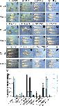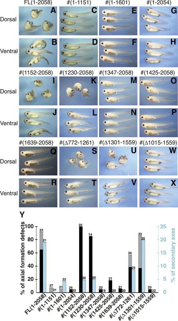 Fig. 8. Both the leucine zipper-like regions (LZL) and the putative PDZ-domain-binding motif are required for xDal function. (AâX) A single ventral blastomere or both dorsal blastomeres of four-cell embryos were injected with mRNA (1 ng). Dorsal or ventral injection of xDal deletion-mutant mRNA: #(1â1151), #(1â1601), #(1â2054), #(1230â2058), #(1347â2058), #(1425â2058), #(1639â2058), or #(δ1015â1559), did not induce partial secondary axes or gastrulation-defective phenotypes. The other deletion mutants, which had greater than one LZL and a putative PDZ-domain-binding motif; #(1152â2058), #(1230â2058), #(δ771â1261), and #(δ1301â1559) had xDal activity. (Y) The above experiments are summarized in the graph. Black and gray bars indicate the frequency of axial formation defects. The black bars indicate severely deformed phenotypes that have open blastopores. The gray bars show mildly deformed phenotypes that have a shorter axis. Blue bars indicate the frequency of partial secondary axis formation. |