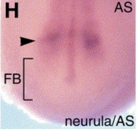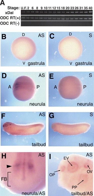 Fig. 3. XDal is expressed during Xenopus embryogenesis. (A) RT-PCR analysis of xDal during Xenopus development. Stages are according to Nieukoop and Faber (1967). XDal was expressed maternally, and its expression began to increase at the two-day tadpole stage. UF, unfertilized egg; ODC, ornithine decalboxyrase. RT(-) indicates the RT-PCR without reverse transcription reaction. (Bâ I) Whole-mount in situ hybridization analysis of xDal. (B), (D), (F), (H), and (I) show the results with the antisense probe (AS), whereas (C), (E), and (G) show the results with the sense probe (S) for negative controls. (B, C) Gastrula (Stage 10.5, vegetal view; dorsal is top), (D, E) neurula (Stage 15, dorsal view; anterior is left), (F, G) late tailbud (Stage 30, lateral view; anterior is left), (H) magnified image of the anterior view of neurula. Arrowhead shows intense expression of xDal at the presumptive midbrain region, whereas a square rectangle shows a presumptive forebrain. (I) A magnified image of the head region of tadpole. Several neural tissues express xDal. EV, eye vesicle; OP, olfactory placode; OV, otic vesicle; PP, pharyngeal pouch. D, dorsal; V, ventral; A, anterior; P, posterior. |