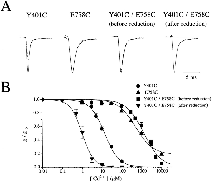 Replacement of individual P-loop residues with cysteines in rat skeletal muscle Na+ channels (SkM1) caused an increased sensitivity to current blockade by Cd2+ thus allowing detection of residues lining the pore. Simultaneous replacement of two residues in distinct P-loops created channels with enhanced and reduced sensitivity to Cd2+ block relative to the individual single mutants, suggesting coordinated Cd2+ binding and cross-linking by the inserted sulfhydryl pairs. Double-mutant channels with reduced sensitivity to Cd2+ block showed enhanced sensitivity after the application of sulfhydryl reducing agents. These results allow identification of residue pairs capable of approaching one another to within less than 3.5 A. We often observed that multiple consecutive adjacent residues in one P-loop could coordinately bind Cd2+ with a single residue in another P-loop. These results suggest that, on the time-scale of Cd2+ binding to mutant Na+ channels, P-loops show a high degree of flexibility.