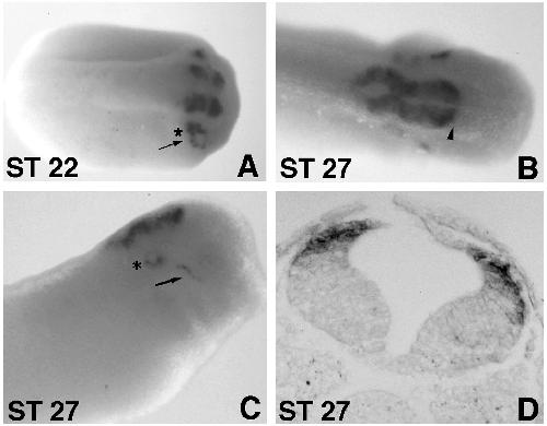 indicated by an asterisk and expression in the trigeminal ganglia is indicated by an arrow (A and C). A cross section of a Stage 27 embryo