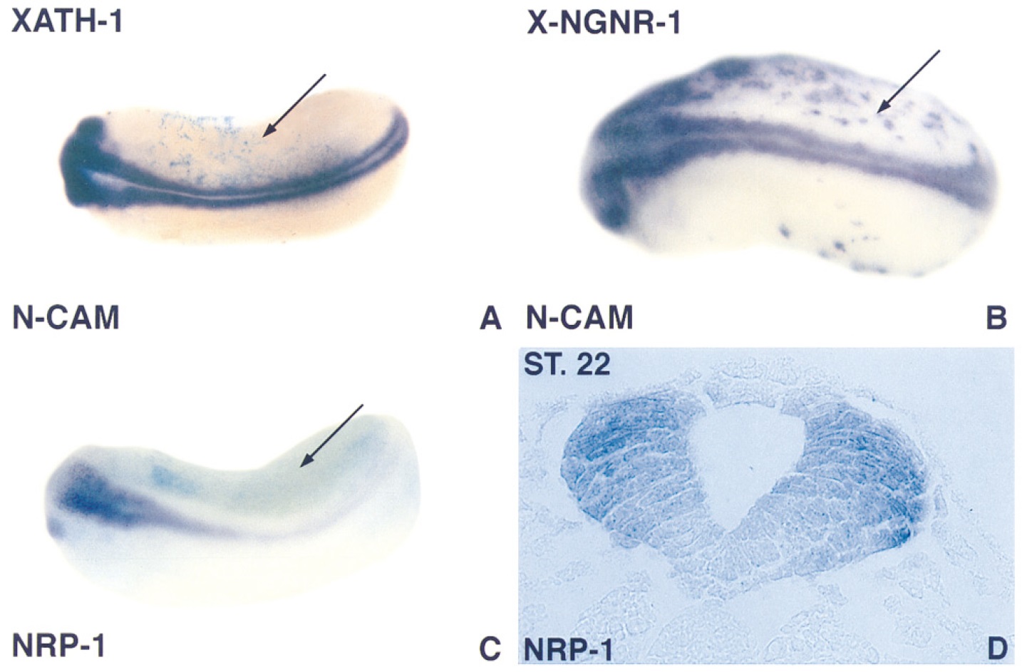 FIG. 5. XATH-1 does not induce the expression of early neural markers. Expression of N-CAM and nrp-1 was analyzed by in situ